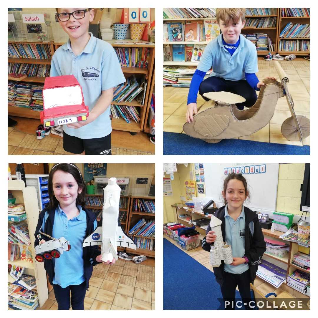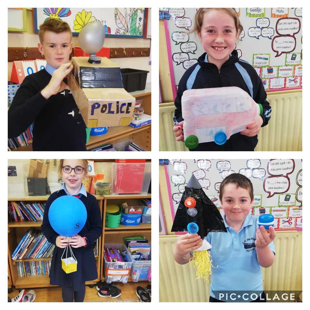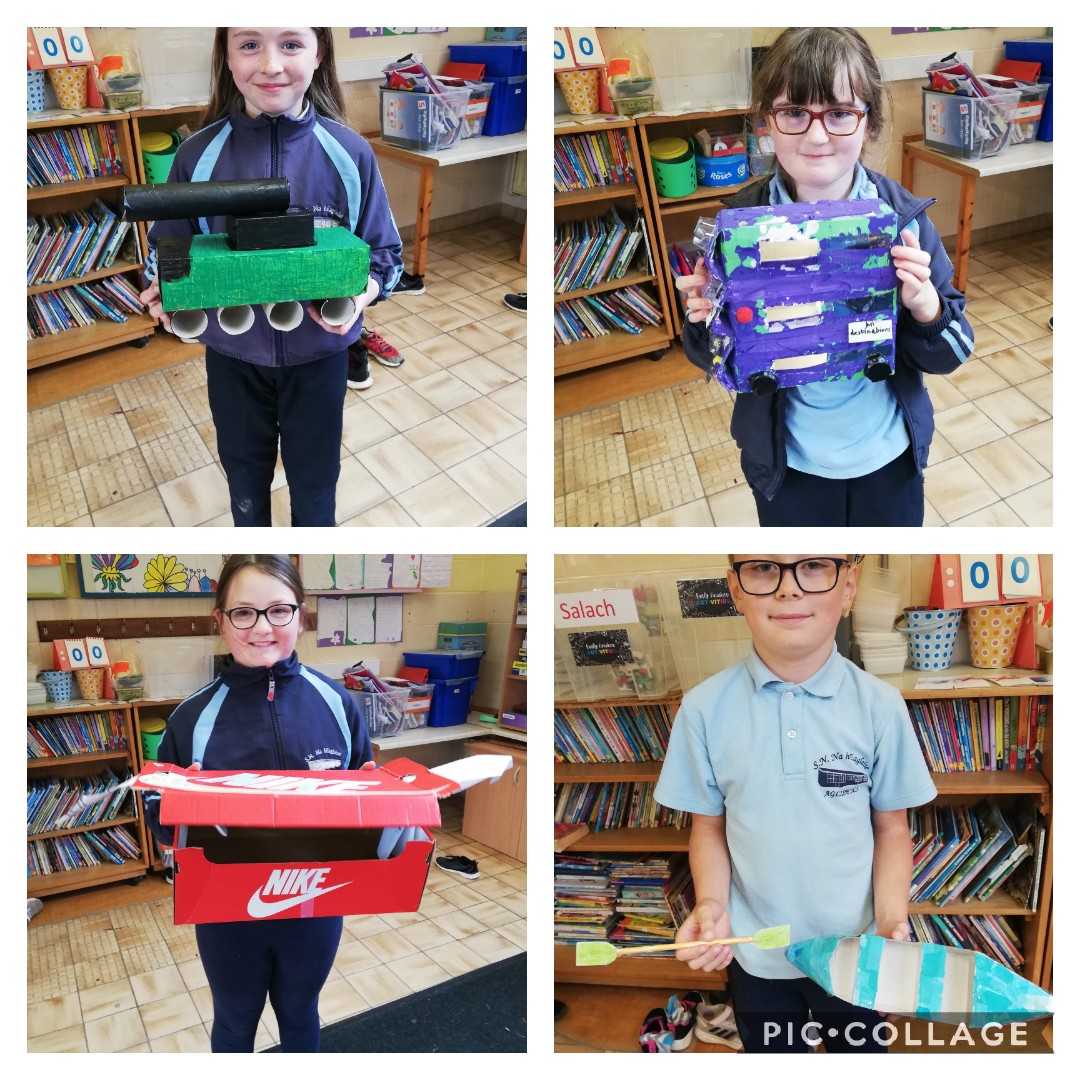 Our theme this month, in Rang a 3 agus Rang a 4, is 'Transport'. We had a project to do at home where we had to make a mode of transport out of our recycling materials. We would like to thank our parents for the amazing help and wonderful creations that came into school last week. We had great fun learning from each other.  We completed reports on Friday morning outlining the materials needed and the methods used to make our particular mode of transport. We are in no doubt, after the presentations, that we have many engineers in the making in Aglish. The future looks bright. Well done everyone!