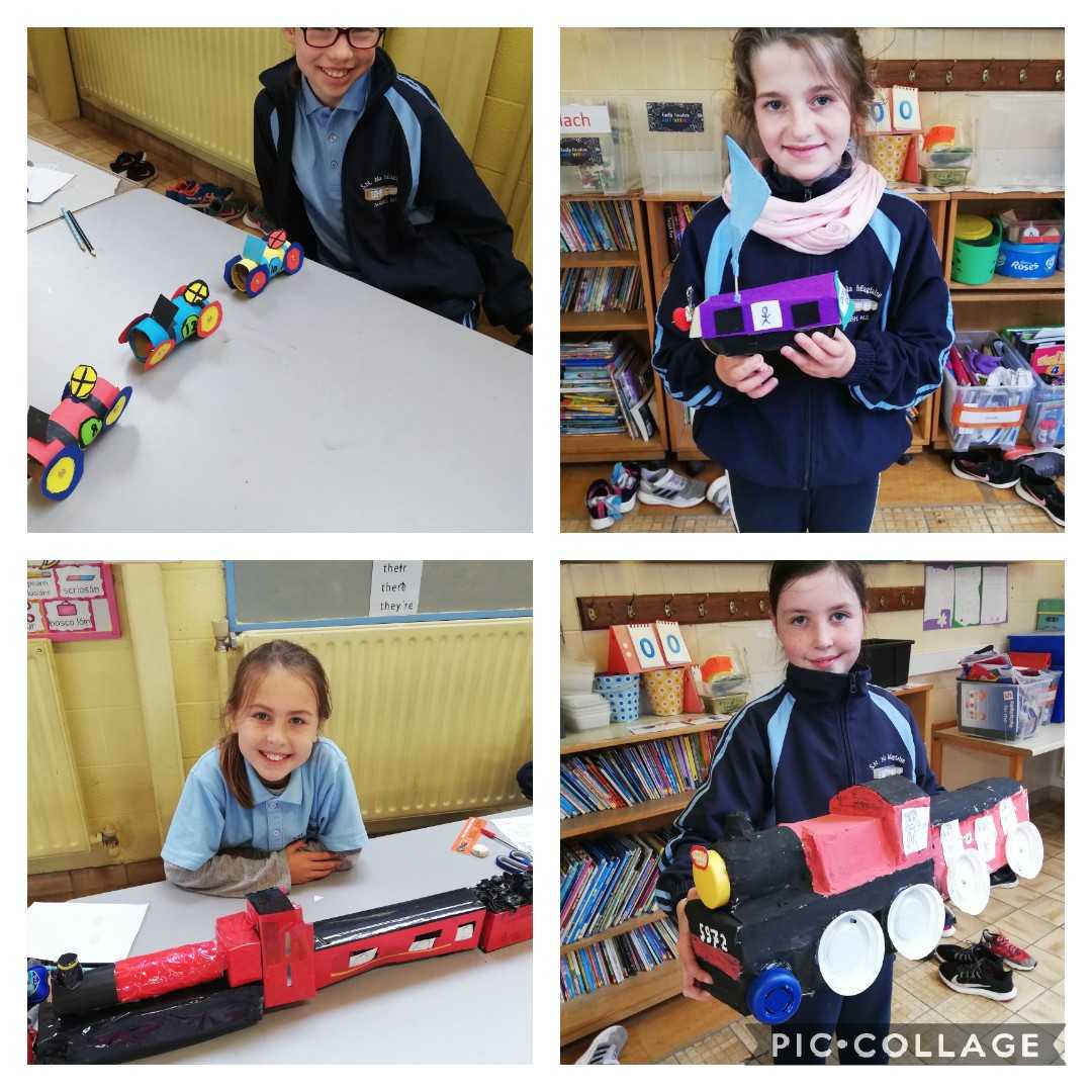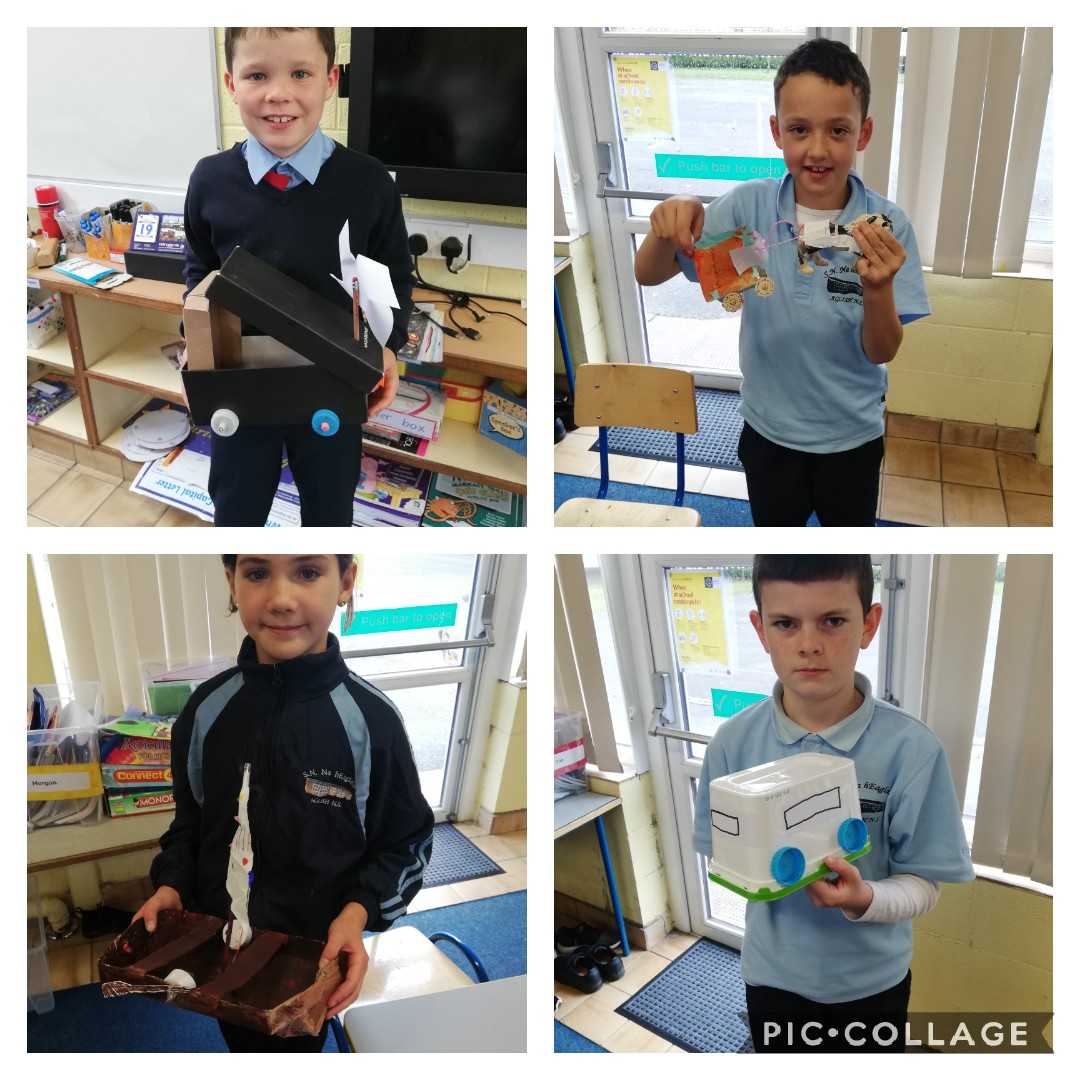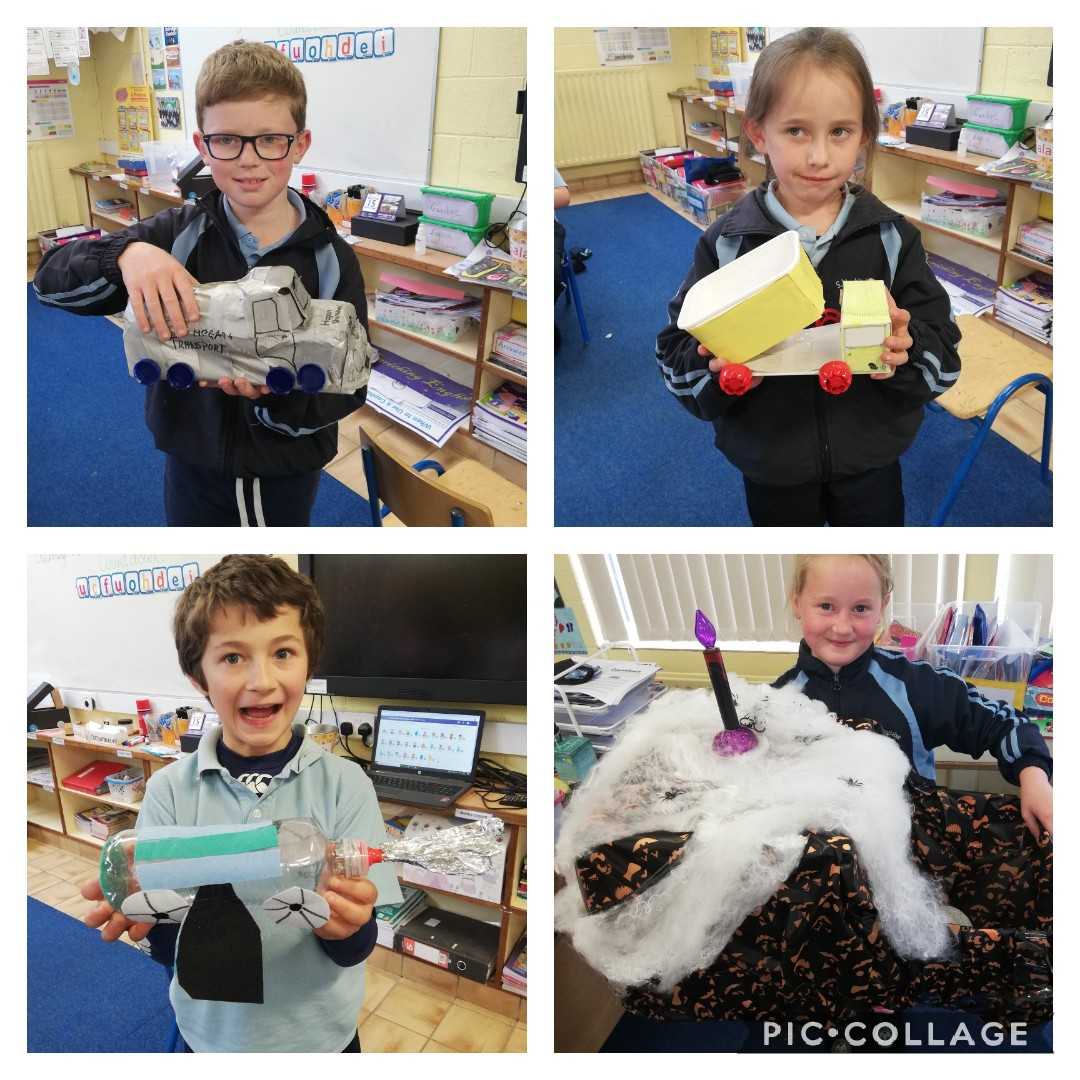 Our theme this month, in Rang a 3 agus Rang a 4, is 'Transport'. We had a project to do at home where we had to make a mode of transport out of our recycling materials. We would like to thank our parents for the amazing help and wonderful creations that came into school last week. We had great fun learning from each other.  We completed reports on Friday morning outlining the materials needed and the methods used to make our particular mode of transport. We are in no doubt, after the presentations, that we have many engineers in the making in Aglish. The future looks bright. Well done everyone!